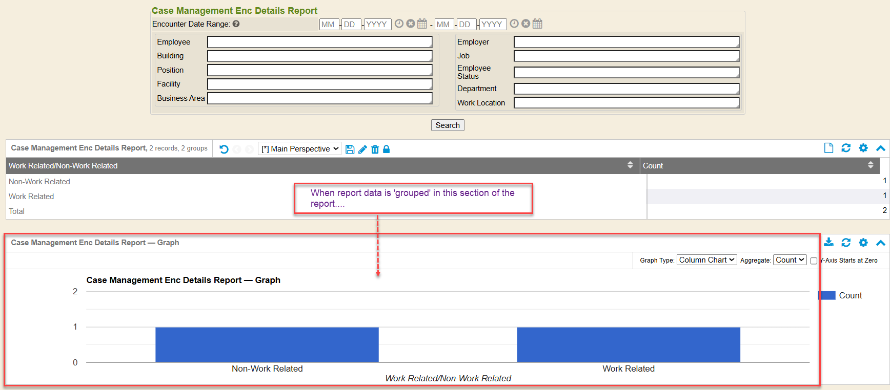 If report data in the Case Management Enc Details Report section of the output is grouped, then the subsequent section titled Case Management Enc Details Report-Graph will output a graph. The user can select the Graph Type from the drop-down to change the graph shown.