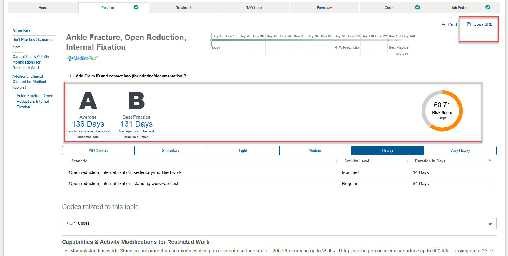 Then will be able to see the retrieved return to work duration guidelines and other information. See ODG’s How to Use the Duration Tab self training PDF guide.