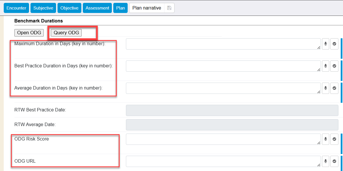 An integration between WebChart and ODG by MCGis available in the 2025-09RC. This integration can improve patient outcomes, reduce administrative costs, and streamline workflows by aligning with industry-standard guidelines. Integration with the ODG by MCG system to access evidence-based guidelines, benchmarking tools, and predictive modeling for best practice and average or maximum days away from work, improving return-to-work (RTW) timelines, medical costs, and quality of care. This integration provides a common framework based on extensive historical claims data (over 10 million lost-time cases), which helps manage costs, reduce inappropriate medical utilization, decrease indemnity costs, and improve worker and patient outcomes.