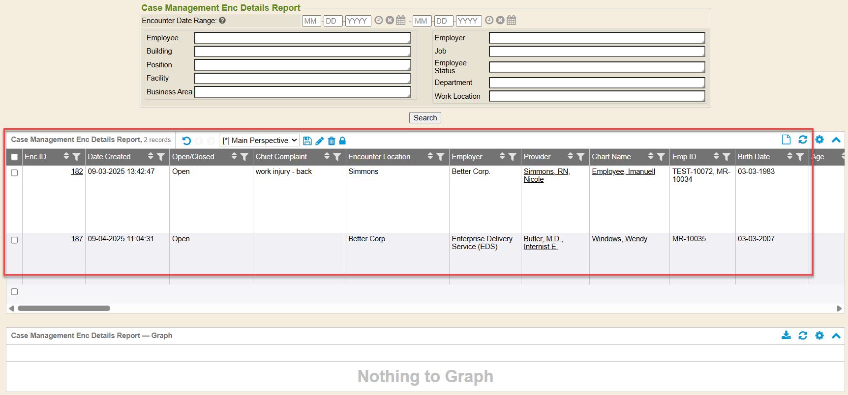 The Case Management Enc (Encounter) Details report compiles detailed occupational health case management data for employees, including demographics, employment details, encounter information, diagnoses, restrictions, accommodations, and key case management milestones. It outputs a comprehensive, filterable summary of each case, supporting tracking, compliance, and analysis of employee health and return-to-work outcomes. The report searches for open or closed Case Management encounters that have a service date within the start/end date range selected (and any other search criteria entered). Note: Excluded from Quality Care charts are omitted from the report output.