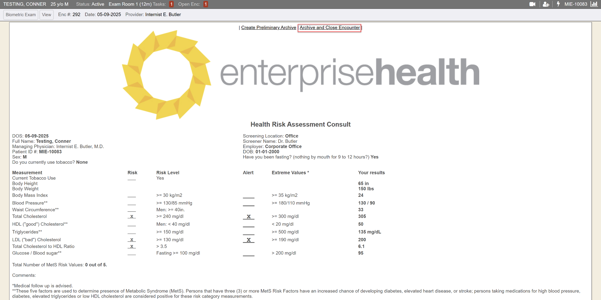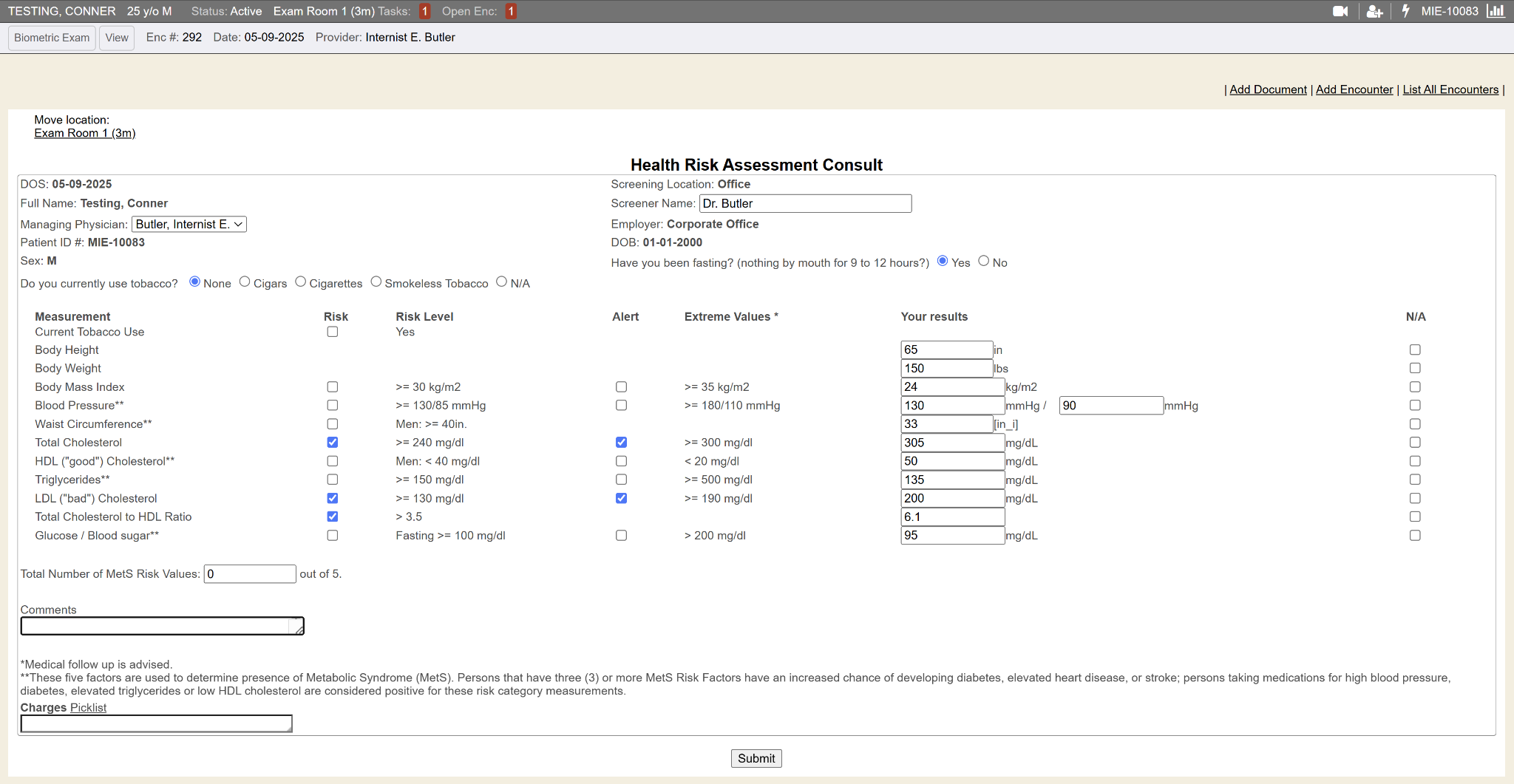 Once the appointment has been checked in, the HRA Consult can be completed. Add the Screener Name and complete the Fasting and Tobacco questions. The Risk and Alert check boxes will be checked automatically based on the results from the screening. The BMI and Total Cholesterol are calculated automatically, as well. The MetS Risk Value is automatically calculated at the end of the assessment. Once completed, click Submit and then Archive and Close the encounter.