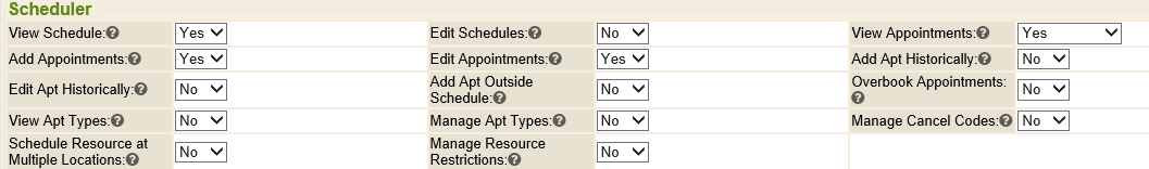 In order to add or manage schedules and appointments in WebChart , the proper security permissions must be provided. For instance, in order to create and manage resource schedules, the security role setting Edit Schedules must be set to Yes. Similarly, to add appointments, the Add Appointments setting must be Yes. If the My Settings preference of Force Default Resources is set to Yes, the Scheduler will show all resources that have an added or edited appointment by you. To view only one resource at a time, ensure this setting is set to No. For more information on some the various settings, review the Security Role Settings documentation.